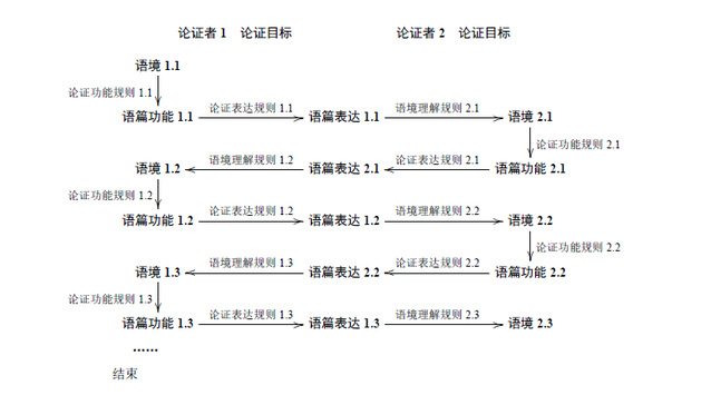 经过上述多层面讨论,鞠老师进而系统性地介绍了他的原创性思想——广义论证理论。广义论证是隶属于一个或多个社会文化群体的成员,即论证参与者,在相应社会文化背景下、依据所属社会文化群体的规范下生成的一个基于语篇的社会互动(话语)序列。其目的是:劝使论证参与者对某事或某观点采取某种态度。由于当下信息传递方式的多模态化,这里的“话语”或“语篇”也包括声音、图像等样态,不过在论证中如何将这些多模态信息转化为话语仍是目前值得关注的前沿问题。与论证的经典定义相比,广义论证定义中论证主体不限制其具体背景等,但主体隶属于一个或多个社会文化群体;广义论证之合理性的依据也不是理性法官而是所属社会文化群体的群体规范,由于群体规范的相对性,广义论证的合理性是局部合理性,基础在于逻辑合理性的文化相对性原则。就论证规则而言,如果该规则符合论证者所属社会文化群体的规范或习俗,同时促进实现论证整体目标,则该规则就是局部合理的。广义论证过程在整体上是一个有序动态的过程,为了在变动语境中达到说理目的,不同的人在不同情境下会依据不同的规则来构建语境、目标、行动方式和策略,由此广义论证的基本结构流程图如下: