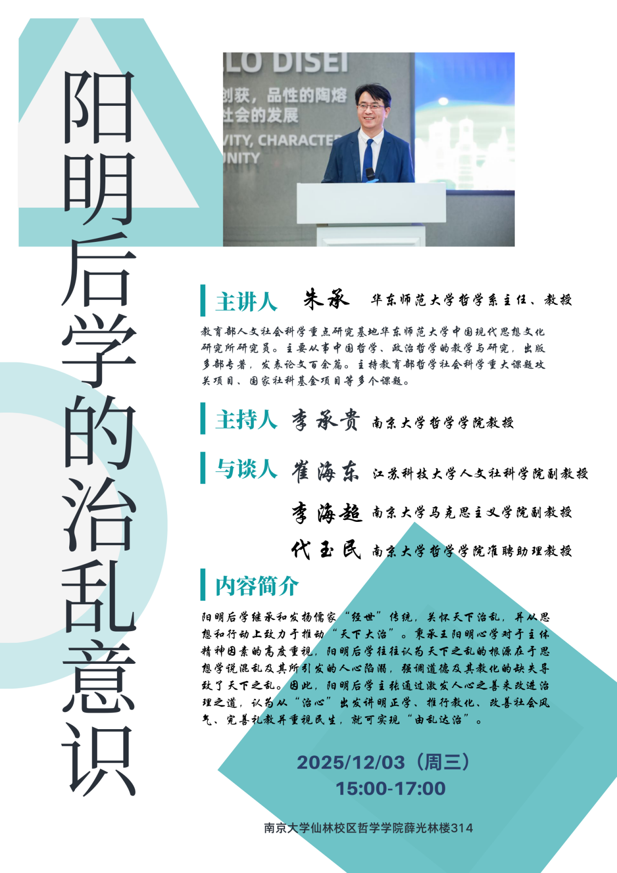 朱承,华东师范大学哲学系主任、教授,教育部人文社会科学重点研究基地华东师范大学中国现代思想文化研究所研究员;浙江大学马一浮书院兼职教授、同济大学经学研究院兼职研究员,贵阳孔学堂学术委员会委员,兼任上海中西哲学与文化比较研究会副会长、上海市儒学研究会副会长等。主要从事中国哲学、政治哲学的教学与研究,出版《礼乐文明与生活政治》《信念与教化——阳明后学的政治哲学》《儒家的如何是好》《治心与治世——王阳明哲学的政治向度》《诗酒精神》等著作,另在《中国社会科学》《哲学研究》等多个期刊发表论文百余篇,主持教育部哲学社会科学重大课题攻关项目、国家社科基金项目等多个课题,曾获教育部人文社科优秀成果二等奖、青年奖以及上海市哲社优秀成果二等奖等奖励。