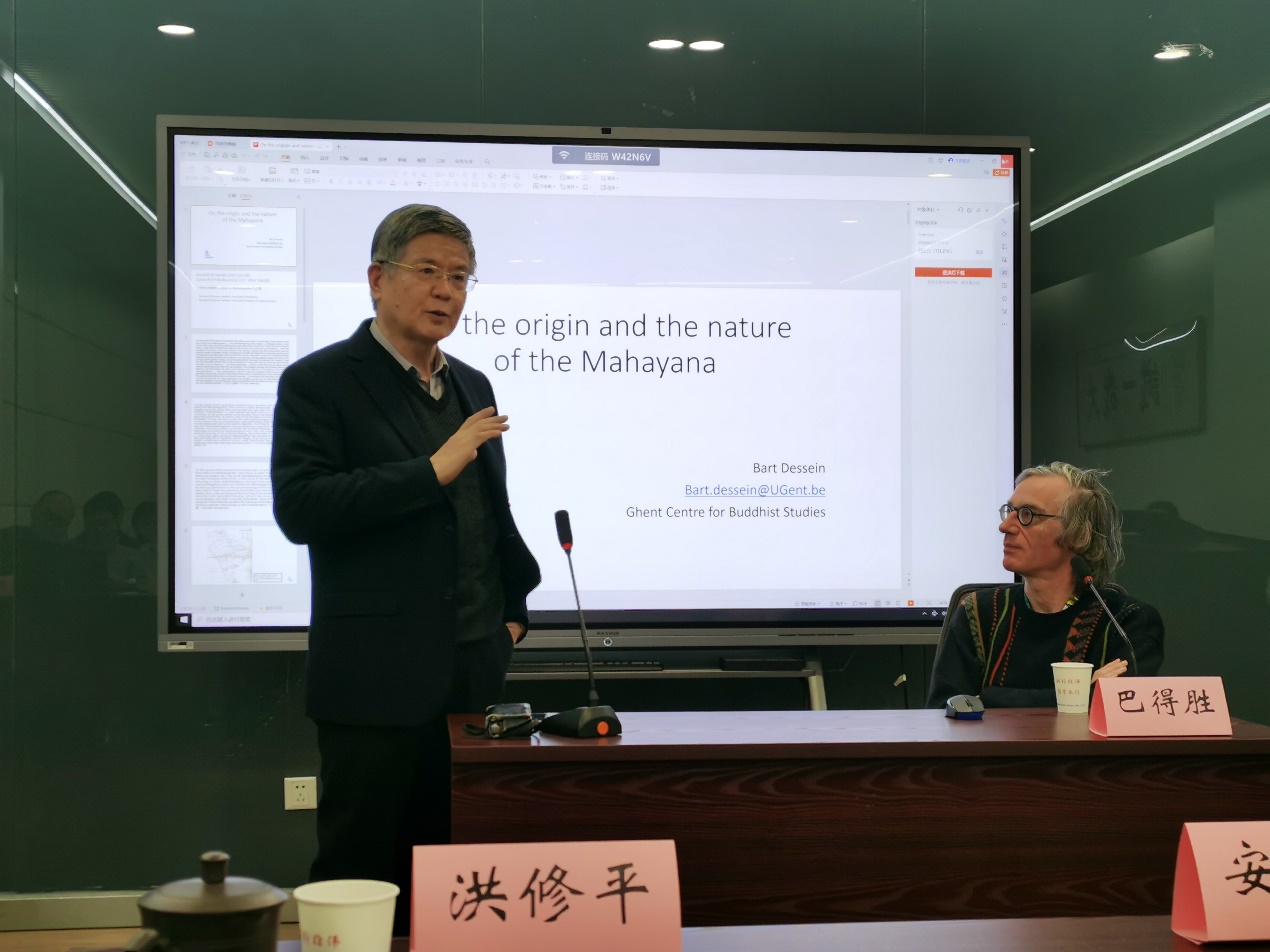 1月4日,应自慰A片 东方哲学与宗教文化研究中心主任洪修平教授邀请,欧洲皇家汉学会前主席、比利时根特大学东方语言与文化系巴得胜(Bart Dessein)教授在自慰A片 哲学系做题为“论大乘佛教的起源与本质”的学术讲座,哲学系相关专业的师生参加了本次讲座。讲座由洪修平教授主持。
