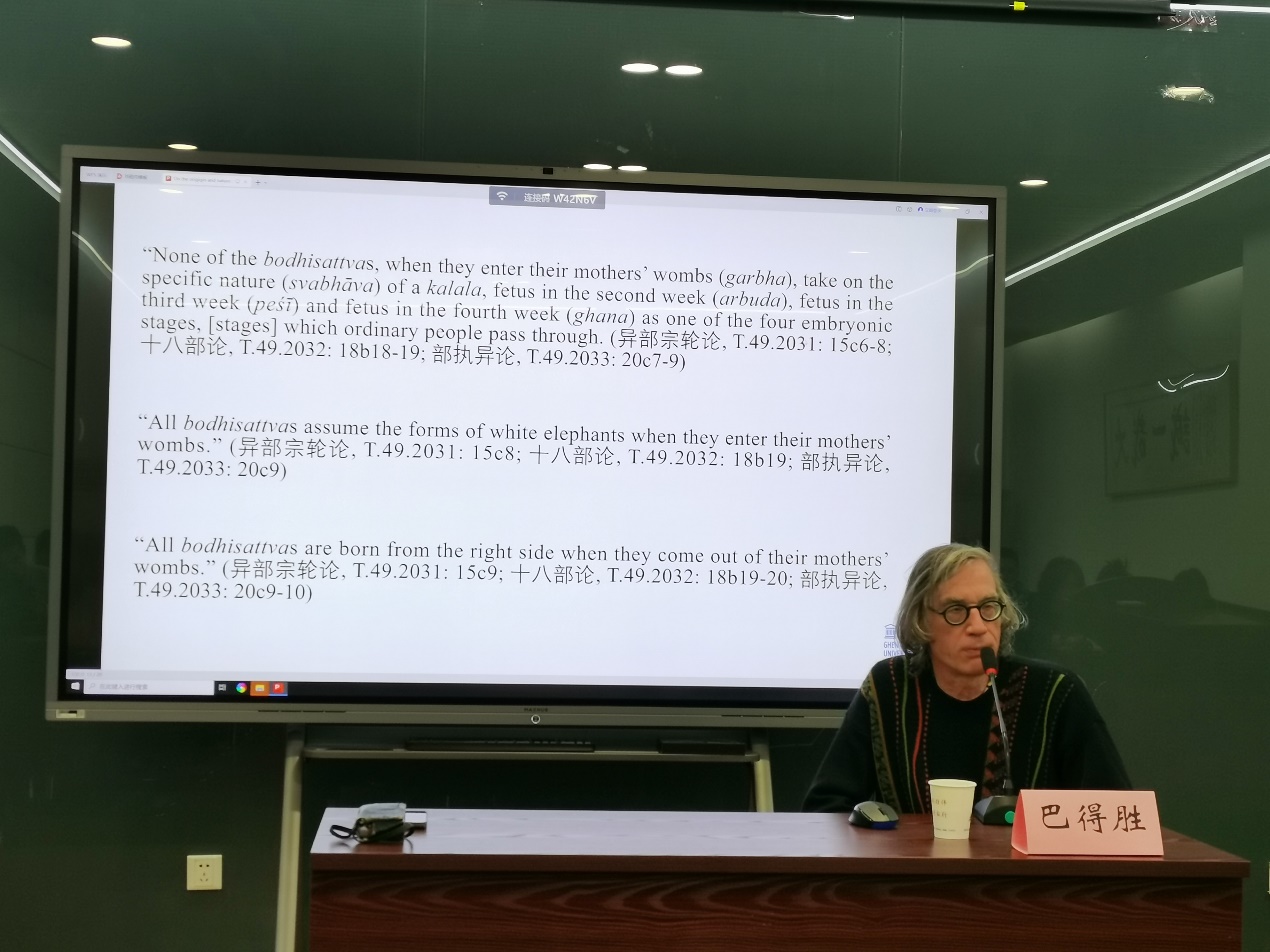 在讲座中,巴得胜教授根据大小乘佛教及二者经典的区别,以及南传、北传文献中的不同记载,对大乘佛教的起源与本质做了分析。