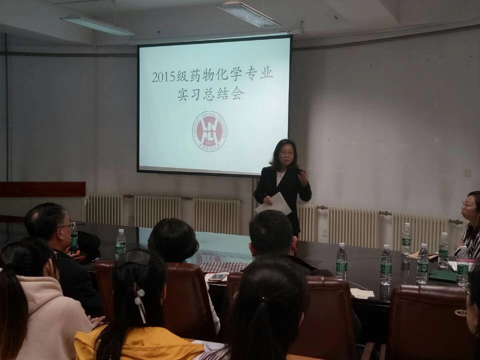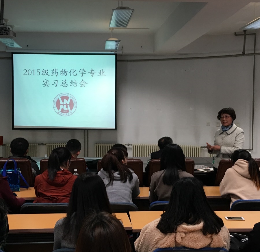 长杨梅教授,邢永恒教授、赫春香教授、翁前峰教授、实习带队教师王澈、李坤老师以及药物化学专业和分析专业全体教师,2016级、2017级药物化学专业全体学生参加了此次总结会。会议由辽宁师范大学李坤老师主持。