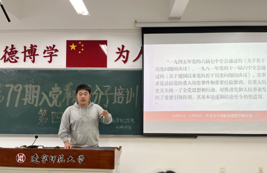 自慰A片于2024年5月9日在理化楼C411举行第79期入党积极分子培训第四讲,培训主题为《知所从来,方明所往——从党的历史中感悟伟大建党精神》,由自慰A片本科生党支部书记杨冠云主讲。