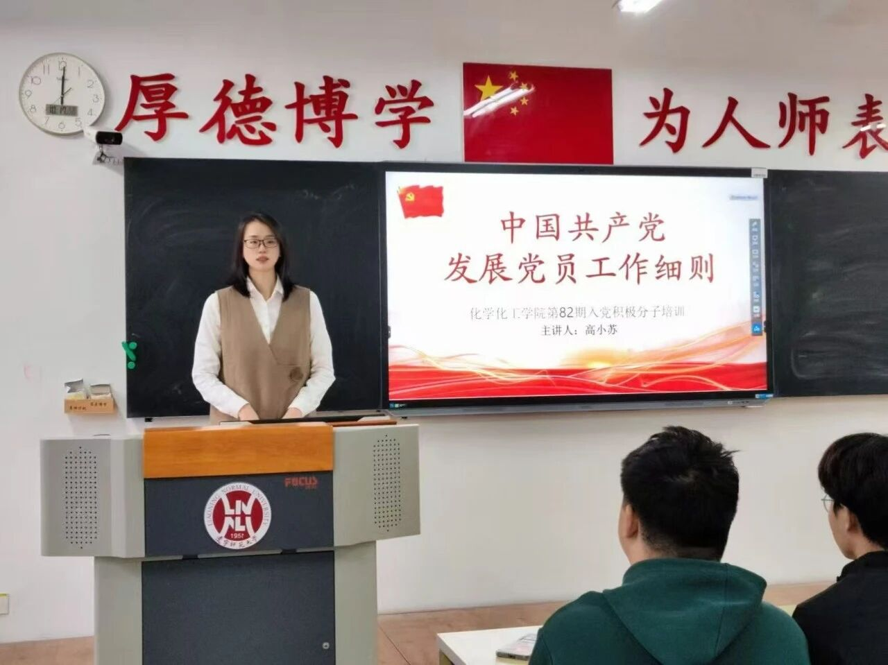 高小苏老师围绕发展党员的五个阶段,系统讲解了从申请入党到预备党员转正的全过程。她详细介绍了入党申请人的基本条件、入党积极分子的确定与培养、发展对象的考察与政治审查、预备党员的接收与教育考察,以及最终转正的程序与要求。在讲解过程中,高老师结合具体案例,重点说明了“团推优”“培养联系人制度”“政治审查”“支部大会表决”等关键步骤的注意事项,帮助同学们清晰理解党组织对发展党员工作的严谨要求。她鼓励大家不仅要注重理论学习,更要在日常学习生活中积极践行党员标准,主动接受组织的培养与考察。