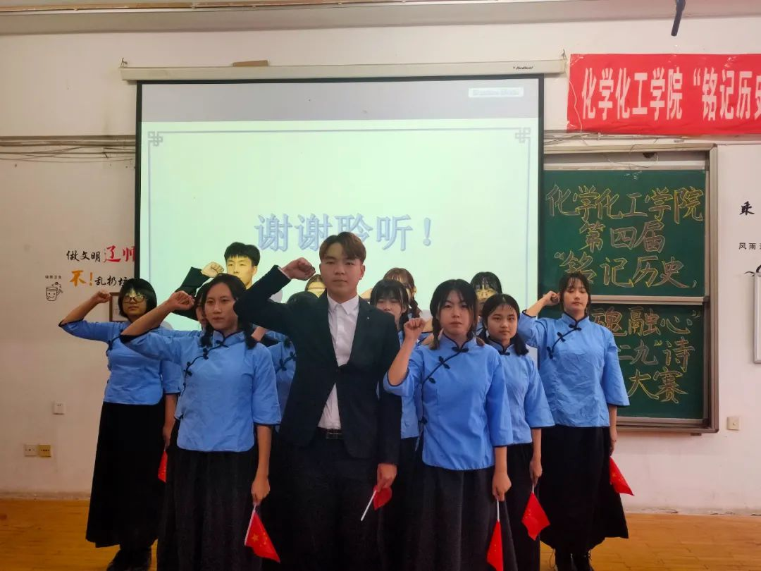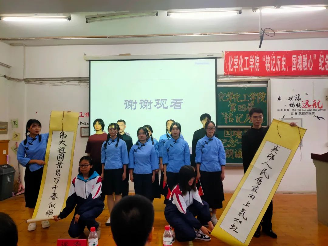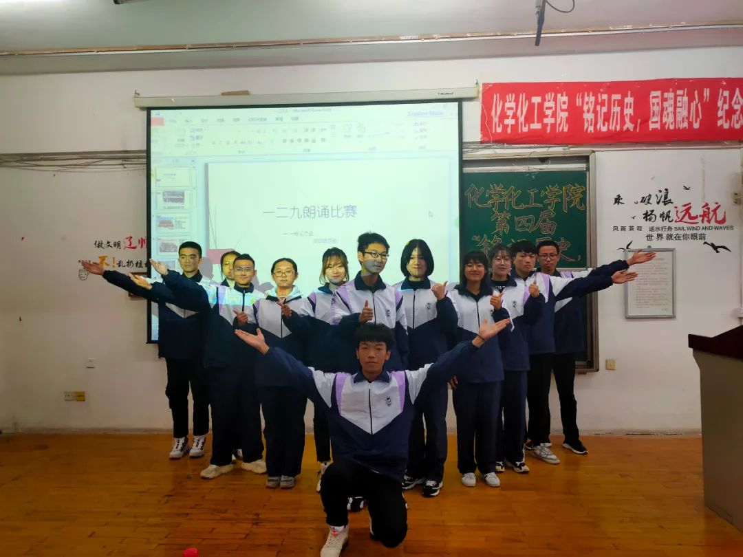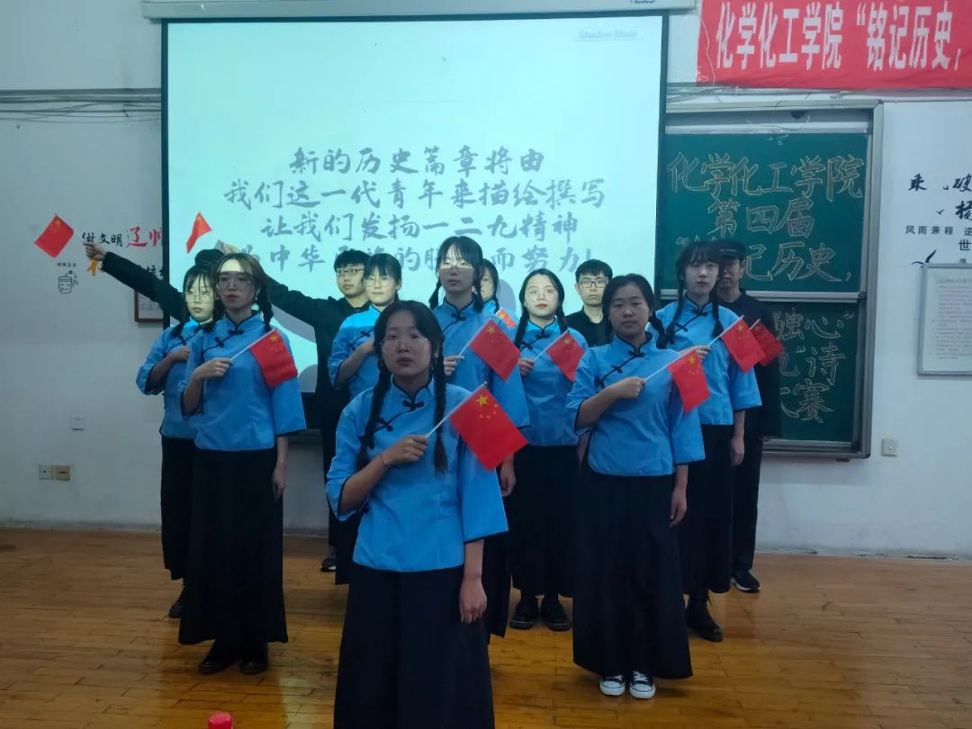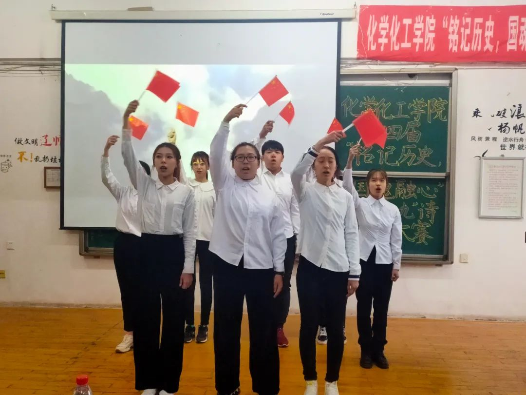 第九组出场的是2019级1班,他们的朗诵主题是《勿忘国耻,续写华章》。