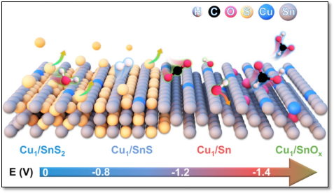 本研究通过开发快速冷冻淬火119Sn穆斯堡尔谱光谱技术,结合多种原位表征手段(如原位拉曼光谱、ATR-SEIRAS、准原位电子显微镜和XPS),系统研究了单铜原子修饰的SnS2(Cu1/SnS2)在电化学CO2还原反应(CO2RR)中的动态演化过程。研究揭示了Cu1/SnS2在反应条件下逐步转化为Cu1/SnS和Cu1/Sn的反应机制,并阐明了这些动态变化对催化性能的影响。