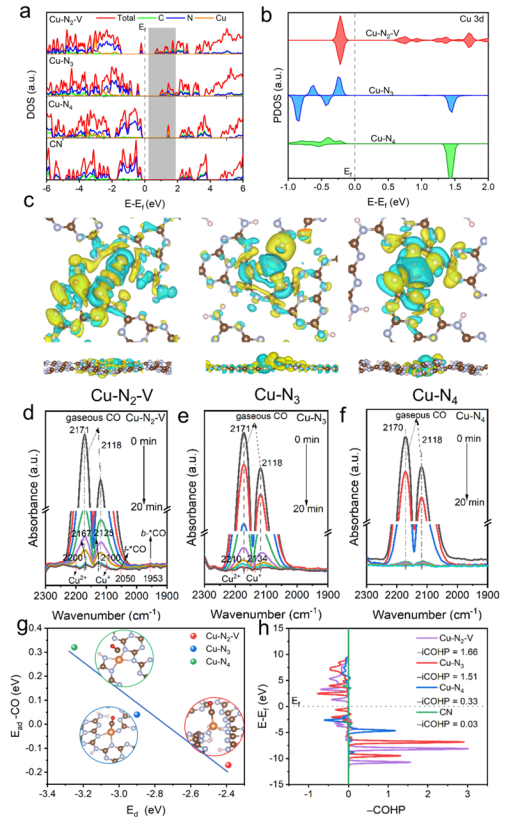 图4. Cu-N2-V、Cu-N3和Cu-N4催化剂电子结构以及CO吸附性能研究